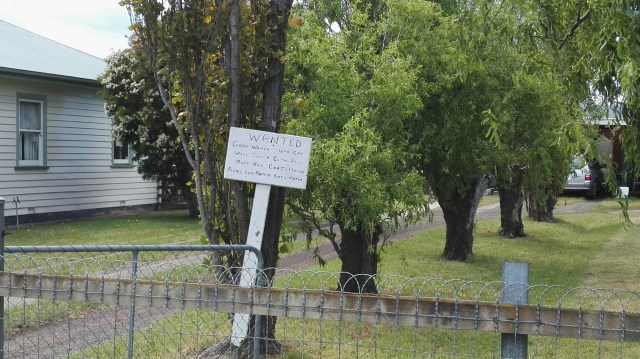 Petite annonce plantée dans un jardin de Triabunna (« cherche bonne femme sachant faire le ménage, cuisiner et laver le poisson. Doit avoir un bateau et un moteur. SVP envoyez photo du bateau et du moteur. »)
